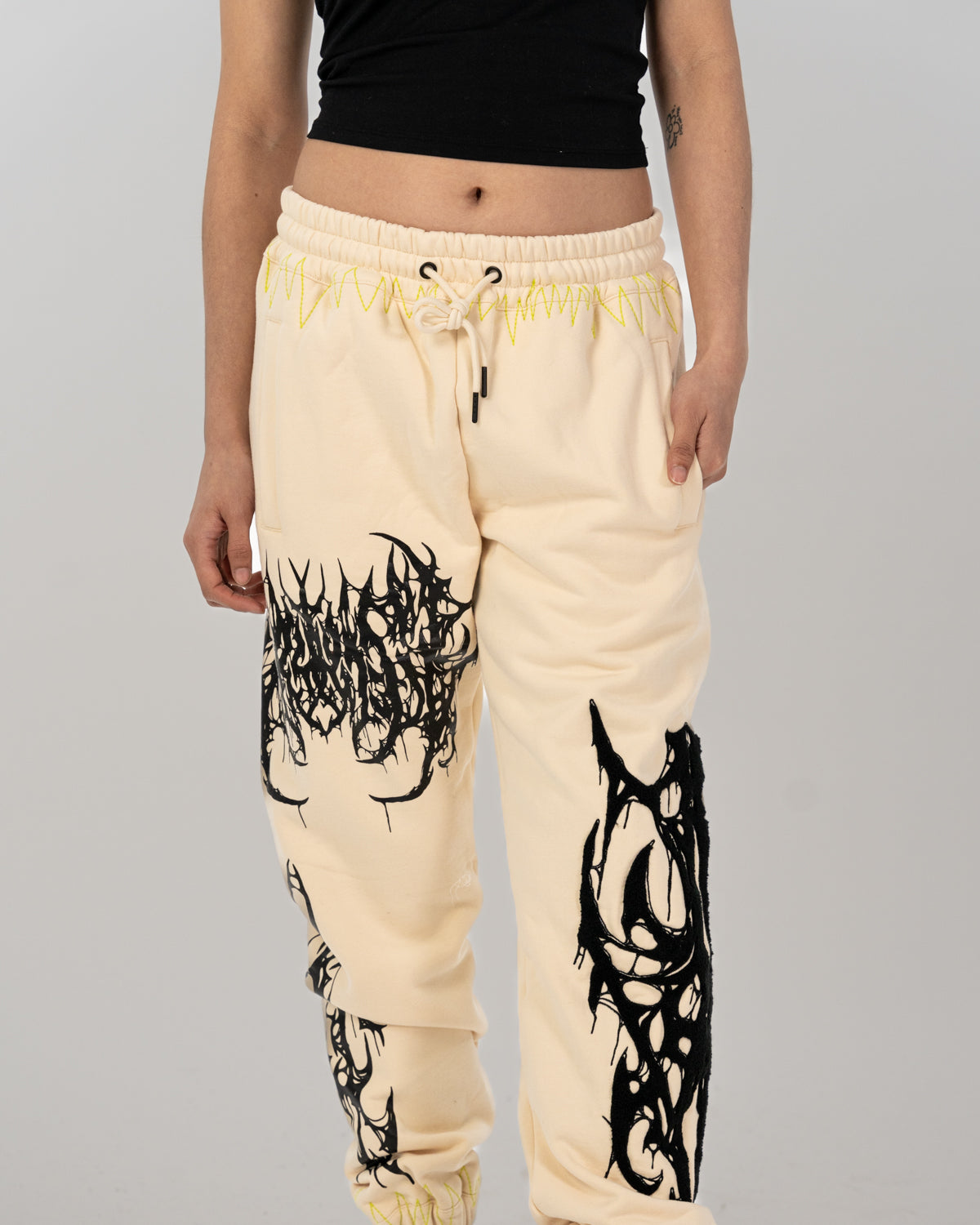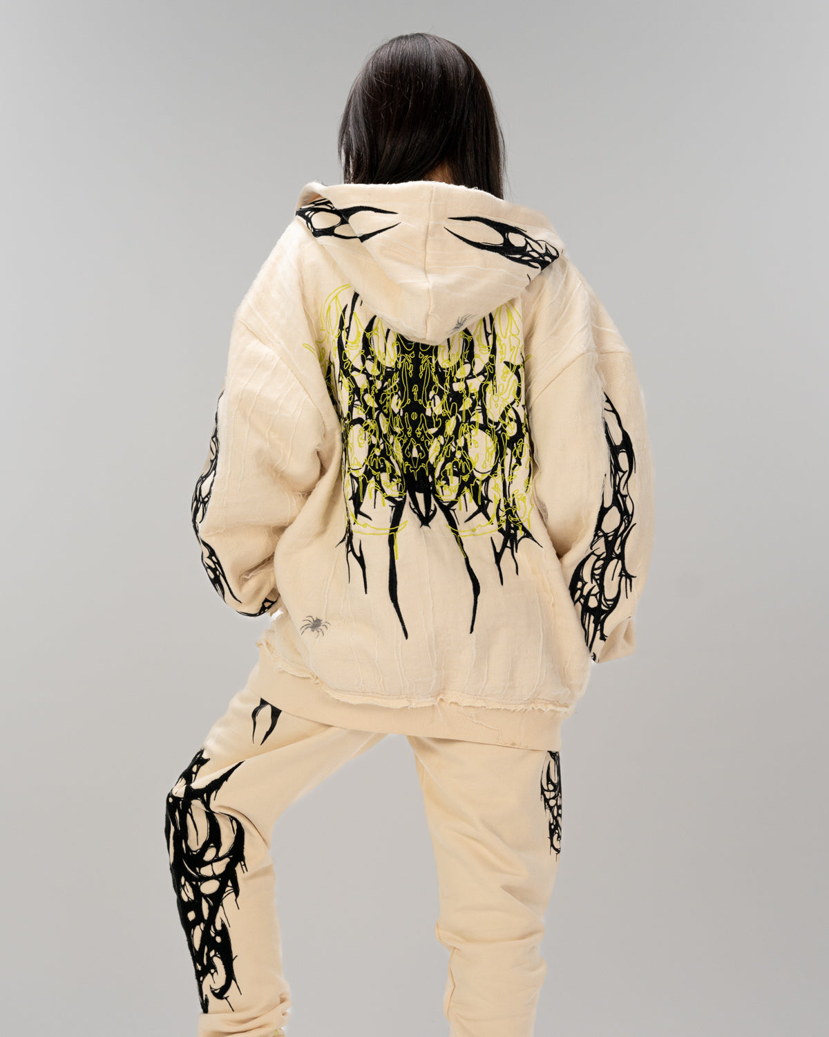 All over screen print, embroidered and tufted graphics